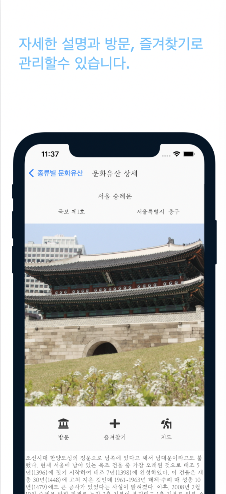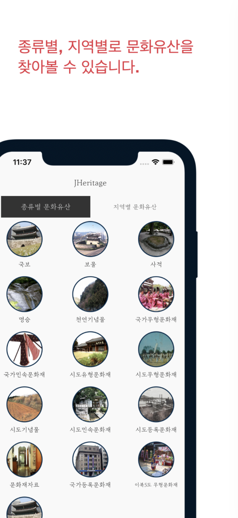대한민국의 문화유산 정보를 보여주는 앱 입니다. 문화유산의 종류와 지역별로 목록을 보여주기도 하고, 검색도 가능합니다.